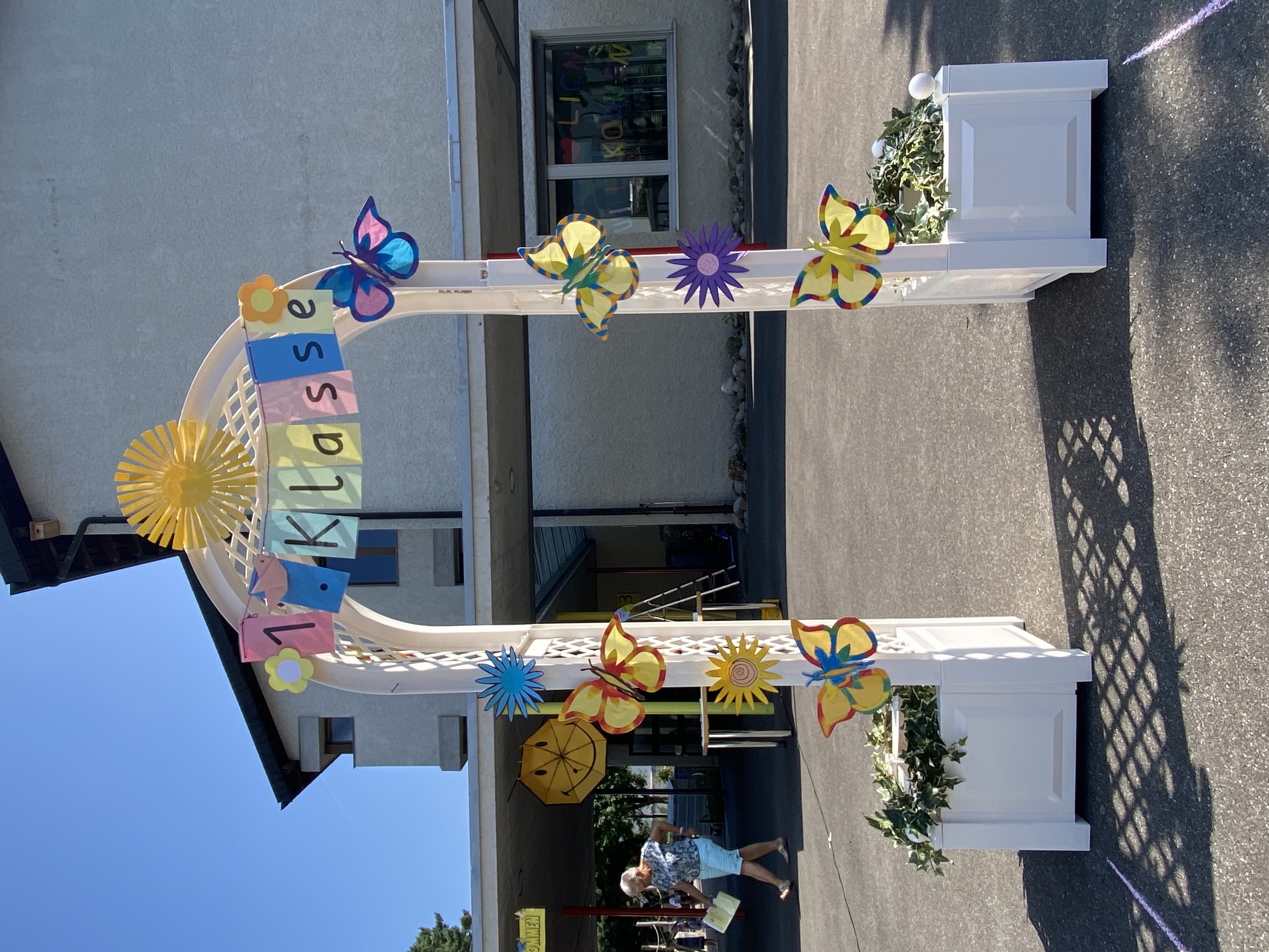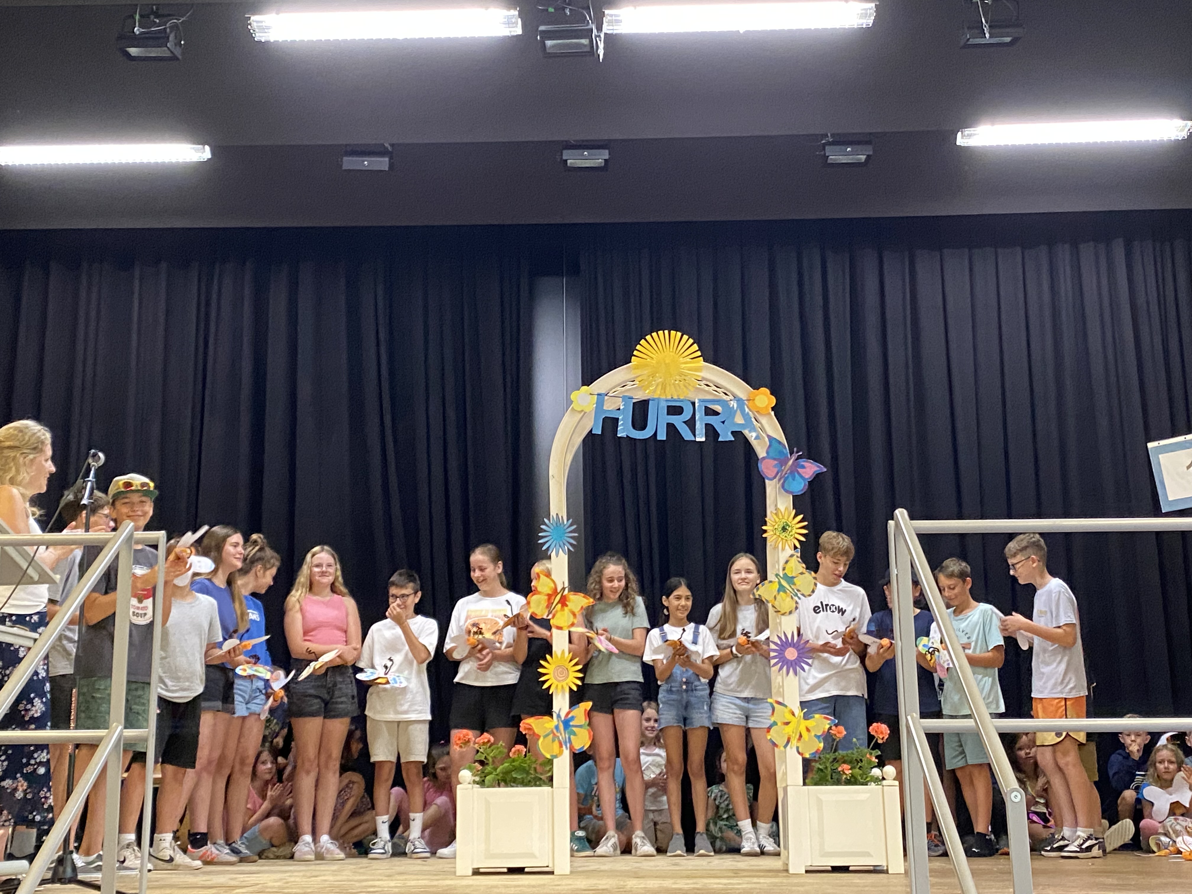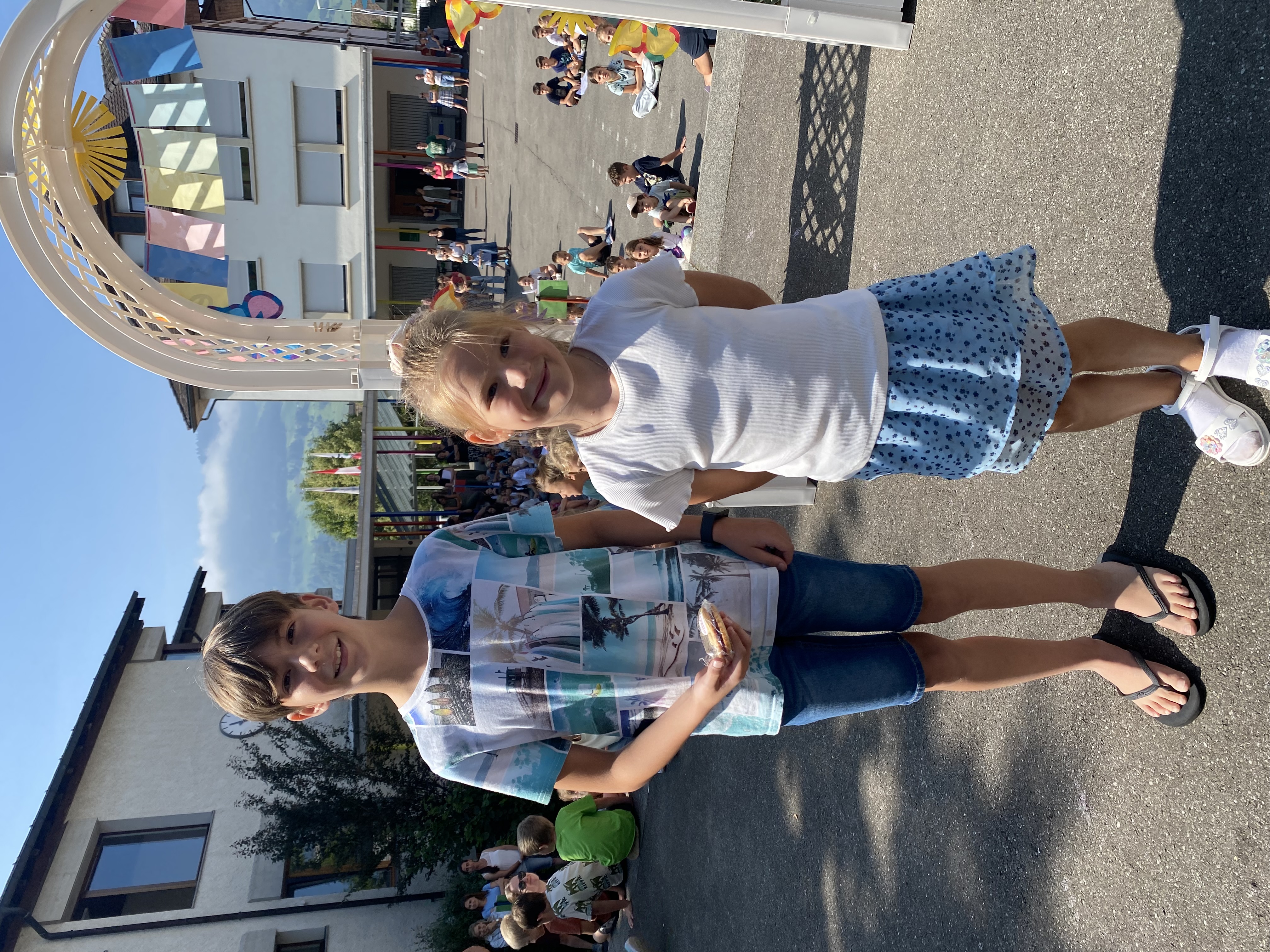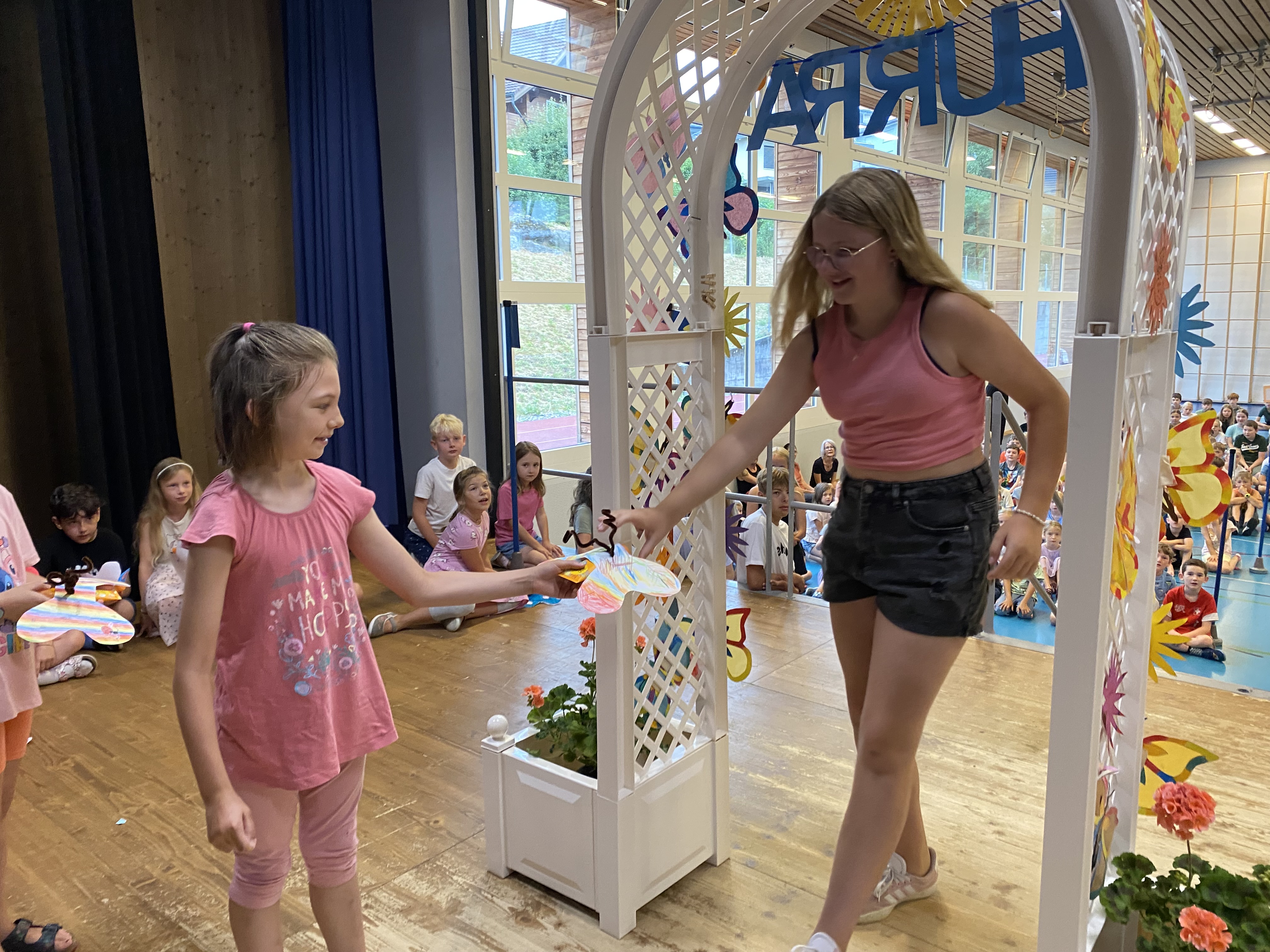 Nach der Begrüssung aller Anwesenden durch Ruth Lötscher haben mehrere Schüler/innen Sätze zu gemeinsam erlebten Ereignissen während dem abgelaufenen Schuljahr vorgelesen. Anschliessend sangen alle zusammen das Lied „Mini Farb und dini“. Lea Immoos bat die SechstklässlerInnen einzeln durch das „Oberstufentor“. Ihnen wurde von ihrem Gottenkind aus der 1.Klasse einen selbstgebastelten Schmetterling mit einer Sonnencreme als Abschiedsgeschenk überreicht.
