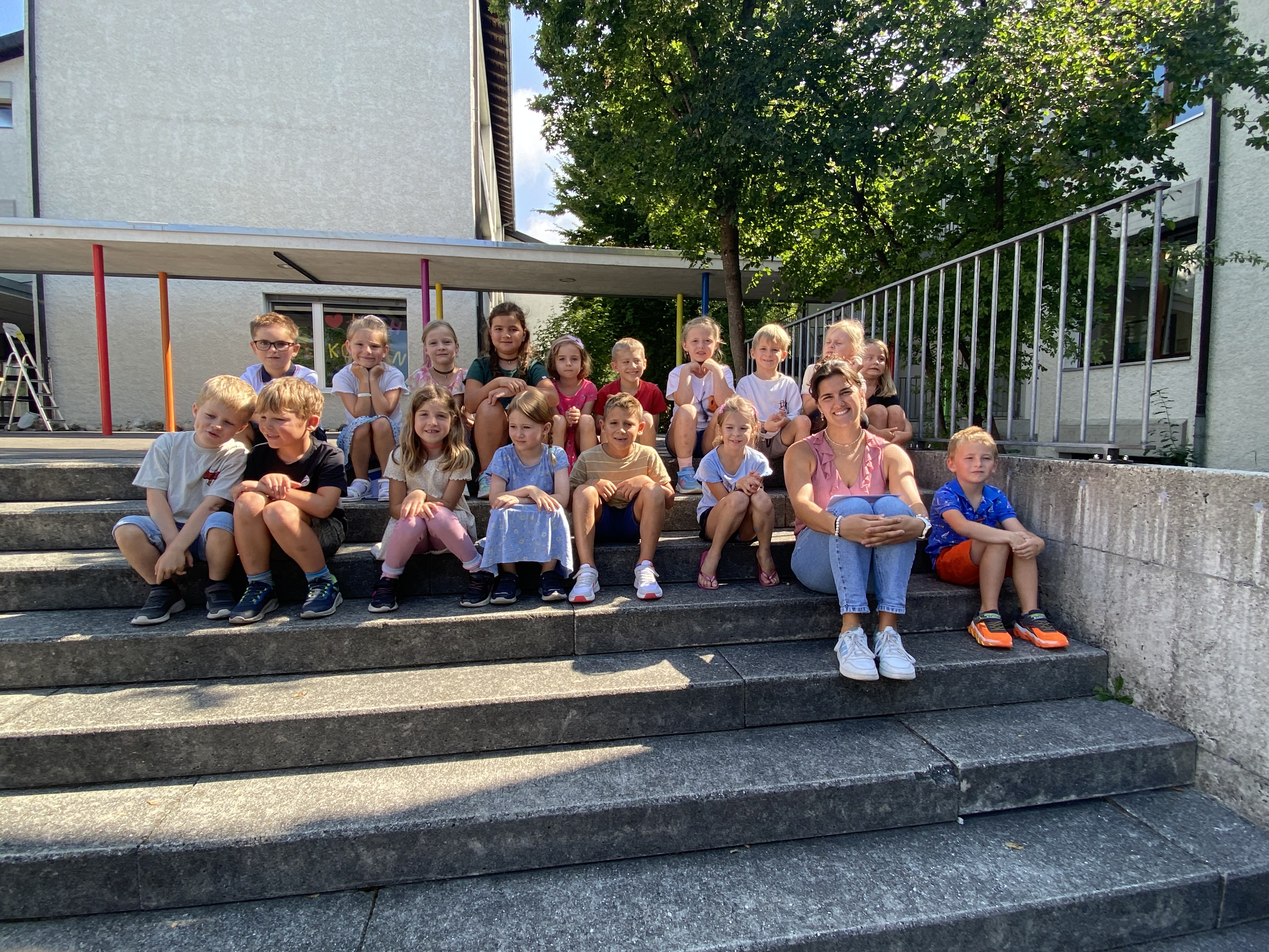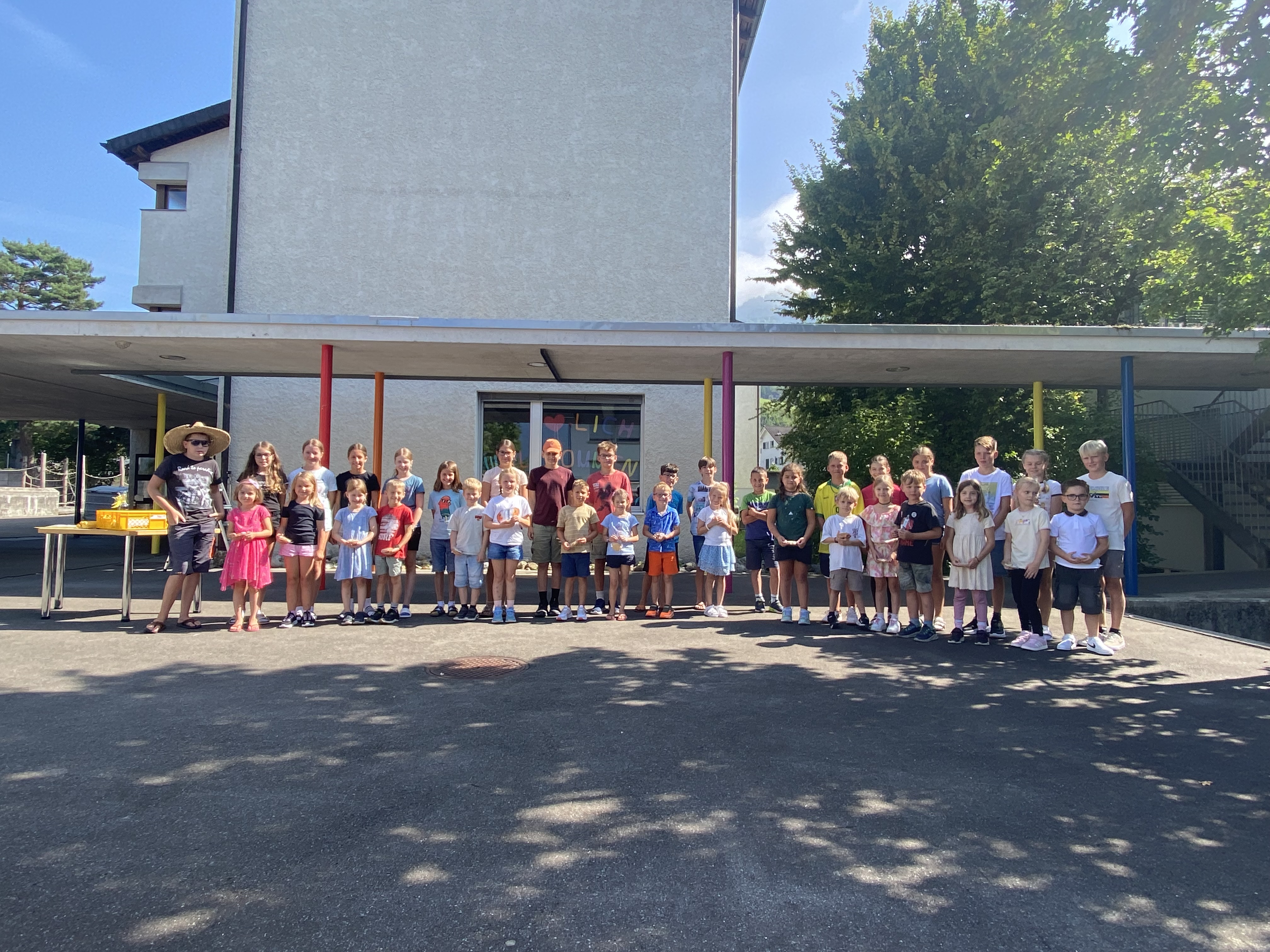 Um 11:10 Uhr versammelten sich alle Klassen mit ihren Lehrpersonen auf dem Pausenplatz. Nach dem Eröffnungslied «Hoi mitenand, willkomme bi üs», begrüsste der Schulleiter Matthias Hasler alle Schulkinder, Lehrpersonen und Eltern und wünschte einen guten Start ins neue Schuljahr.