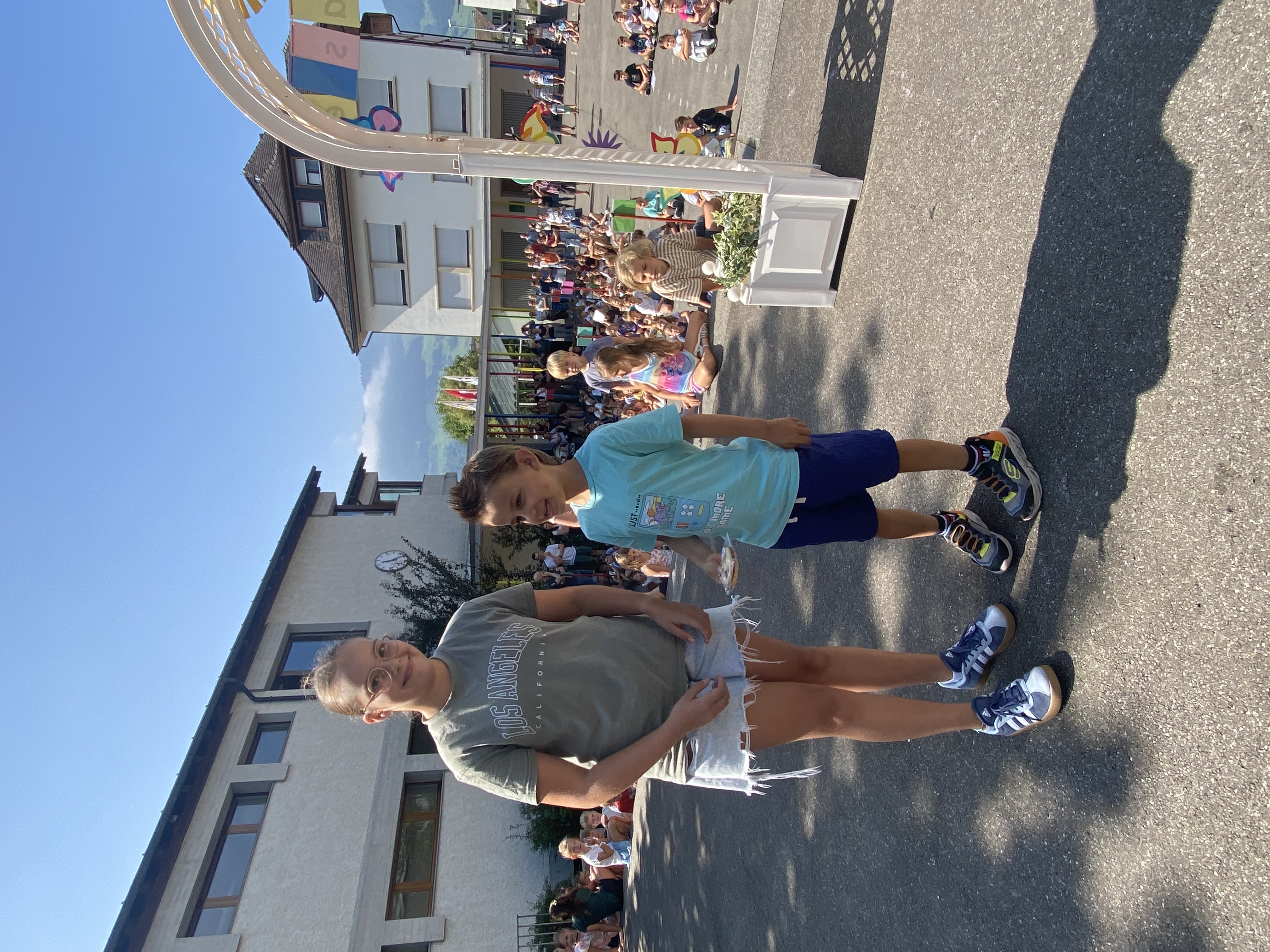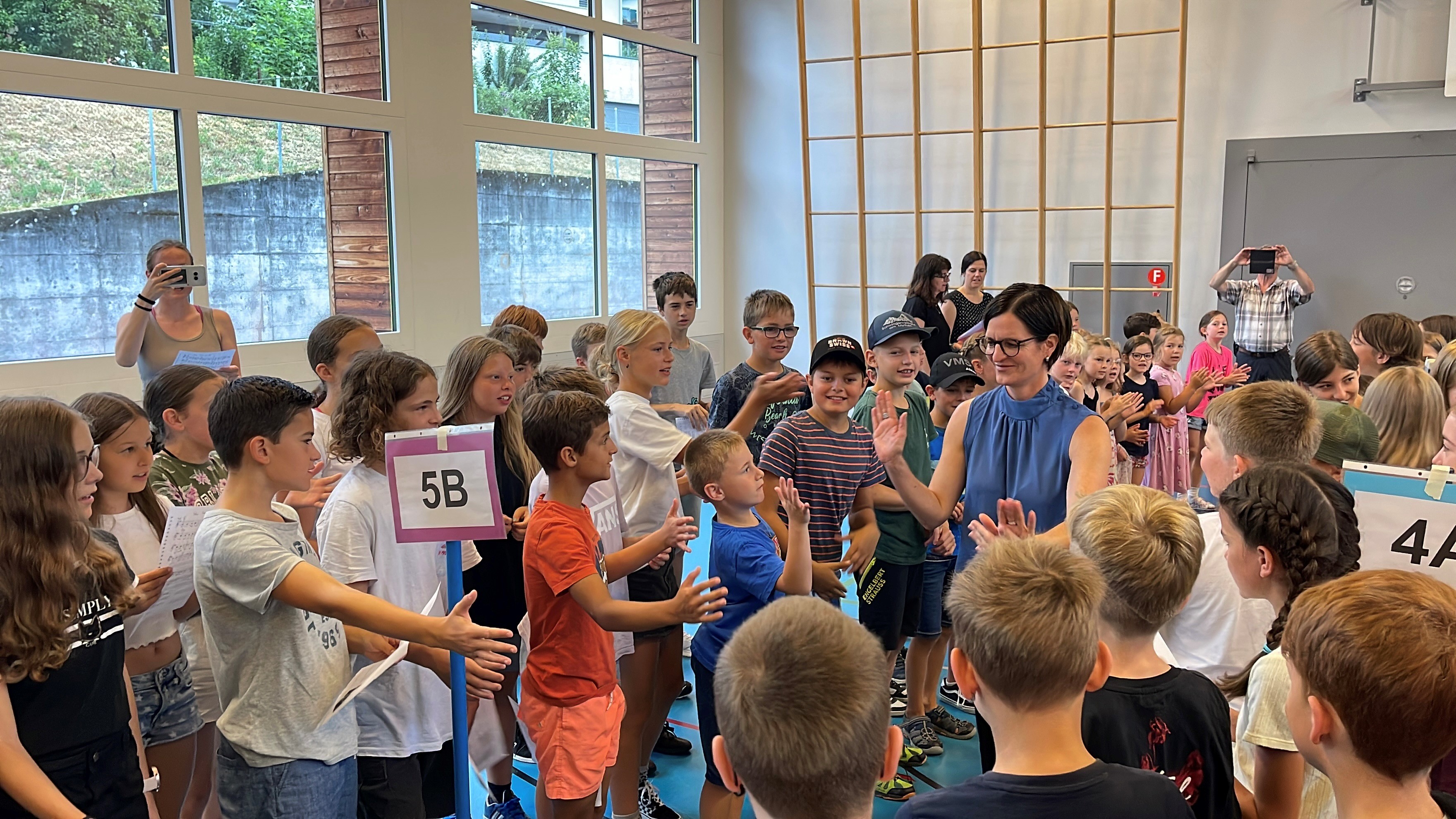 Am Schluss wurden die Sechstklässler/innen persönlich von Raphaela Koller verabschiedet. Dabei bekamen sie ein Badetuch mit besten Wünschen für die Oberstufe mit auf ihren neuen Schulabschnitt.