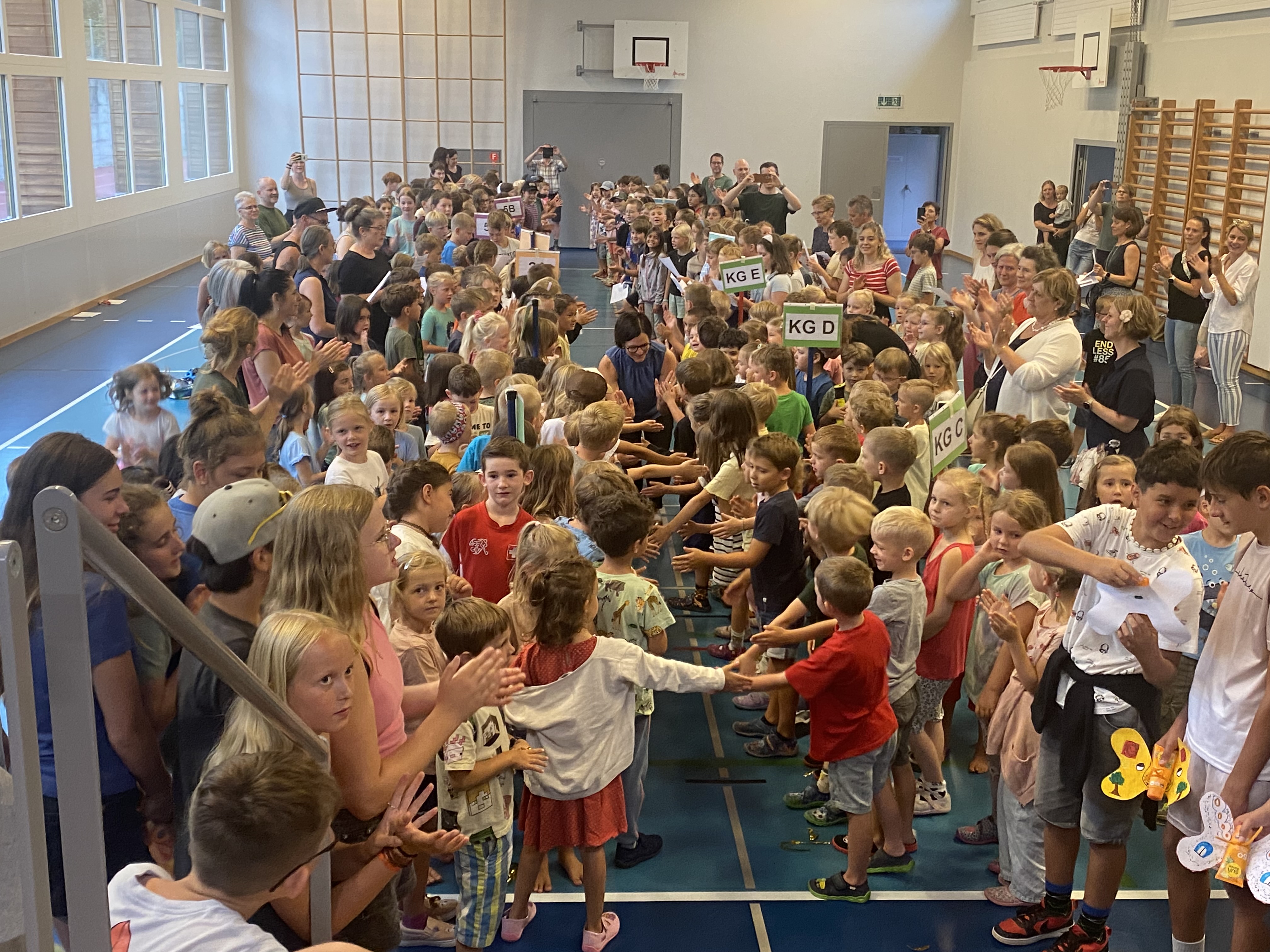 Anschliessend wurden die ABC-Schützen namentlich aufgerufen und durften durch den Erstklass-Torbogen treten. Ihre Gottis oder Göttis aus der 5. und 6. Klasse überreichten ihnen eine süsse Überraschung zum besonderen Tag.
