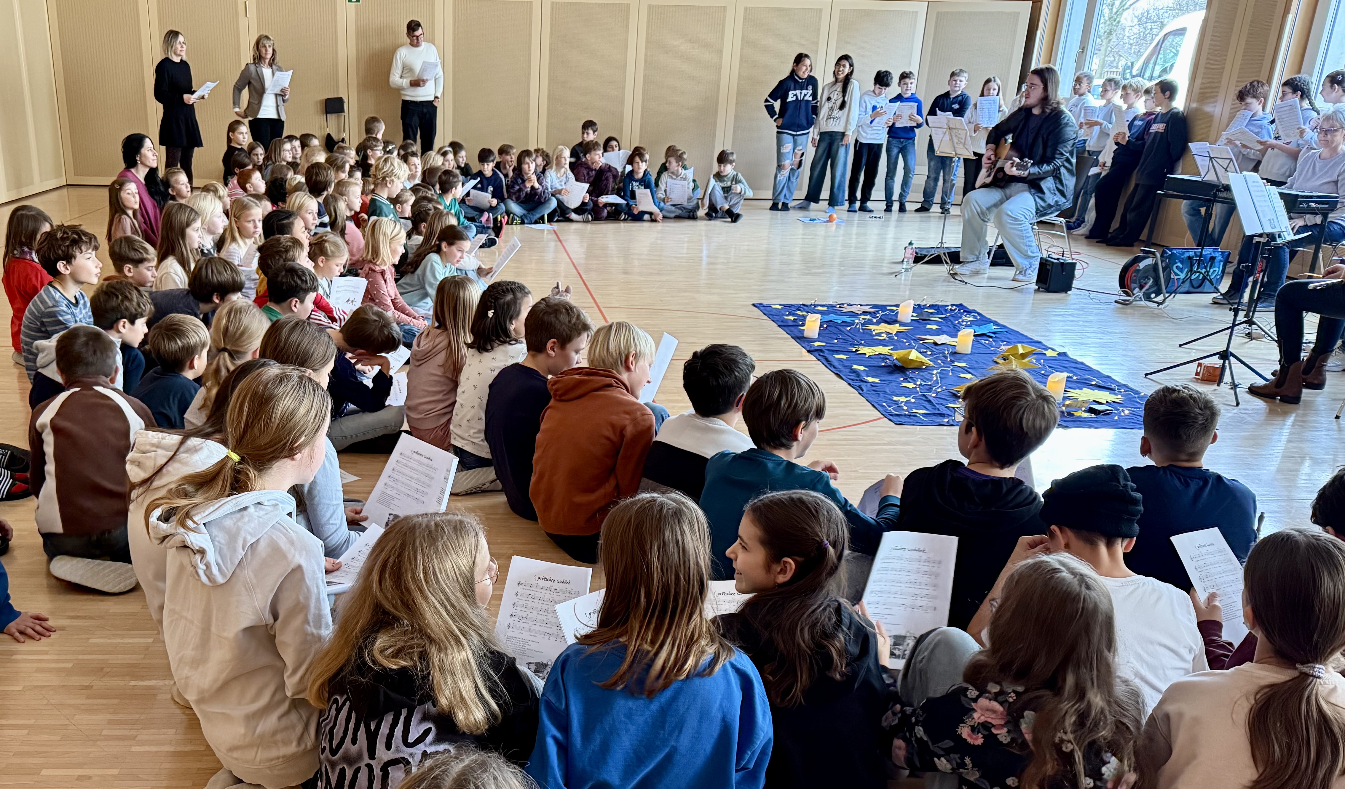 Zum stimmungsvollen Einstieg in die Adventszeit trafen sich die Kinder an drei Tagen zum gemeinsamen Adventssingen in der Aula. Jeweils rund 30 Minuten lang wurden bekannte und neue Weihnachtslieder gesungen. Organisiert wurde das Adventssingen von Rahel Holdener und Dario Heinzer, letzterer hatte gleichzeitig die musikalische Leitung der Lehrerband inne.