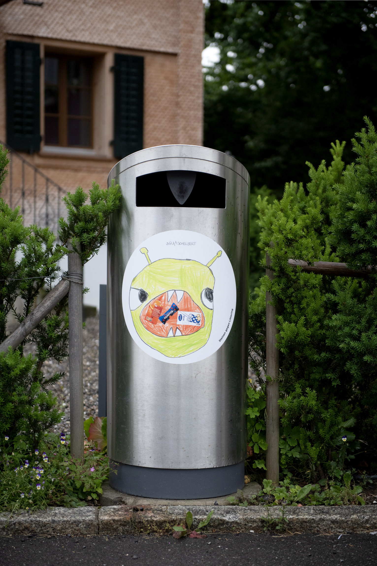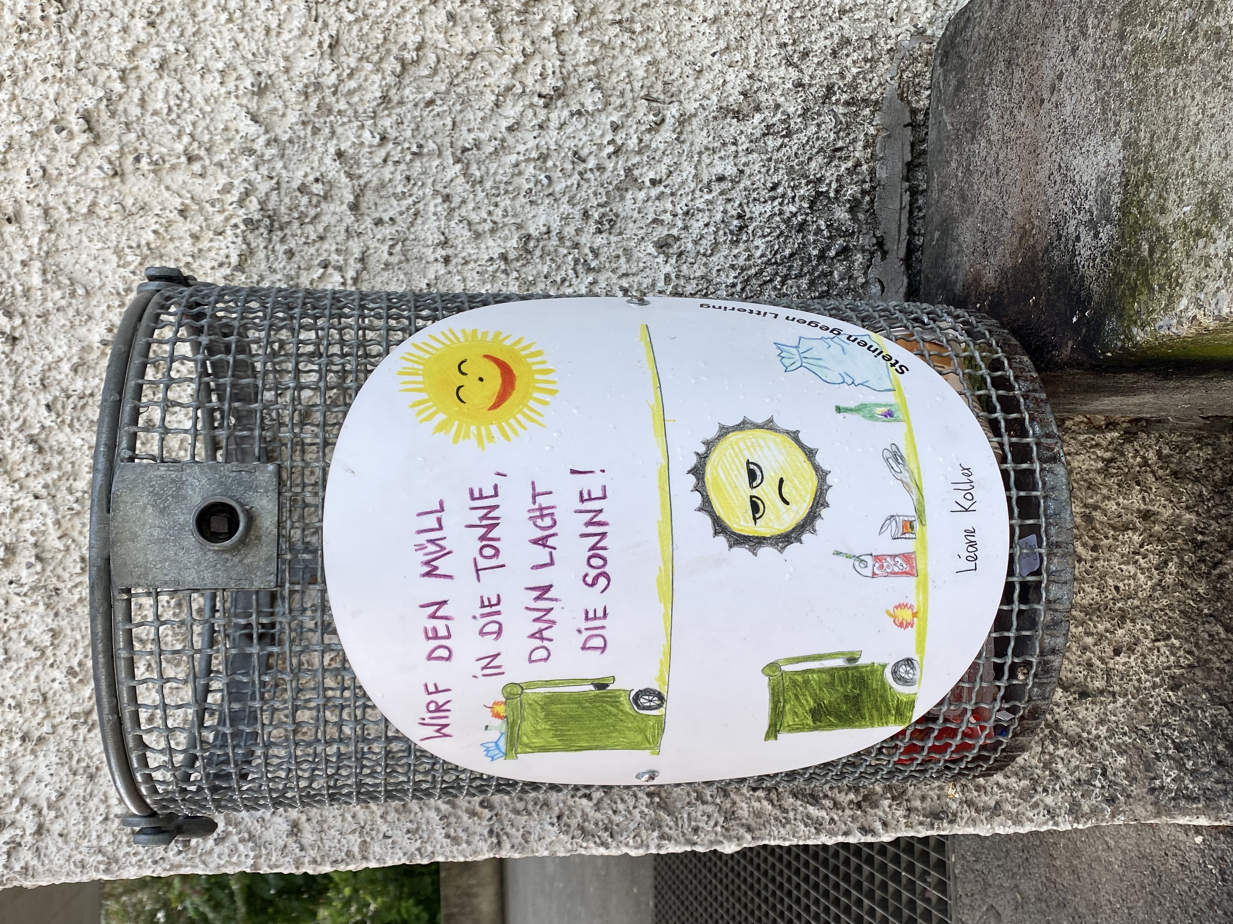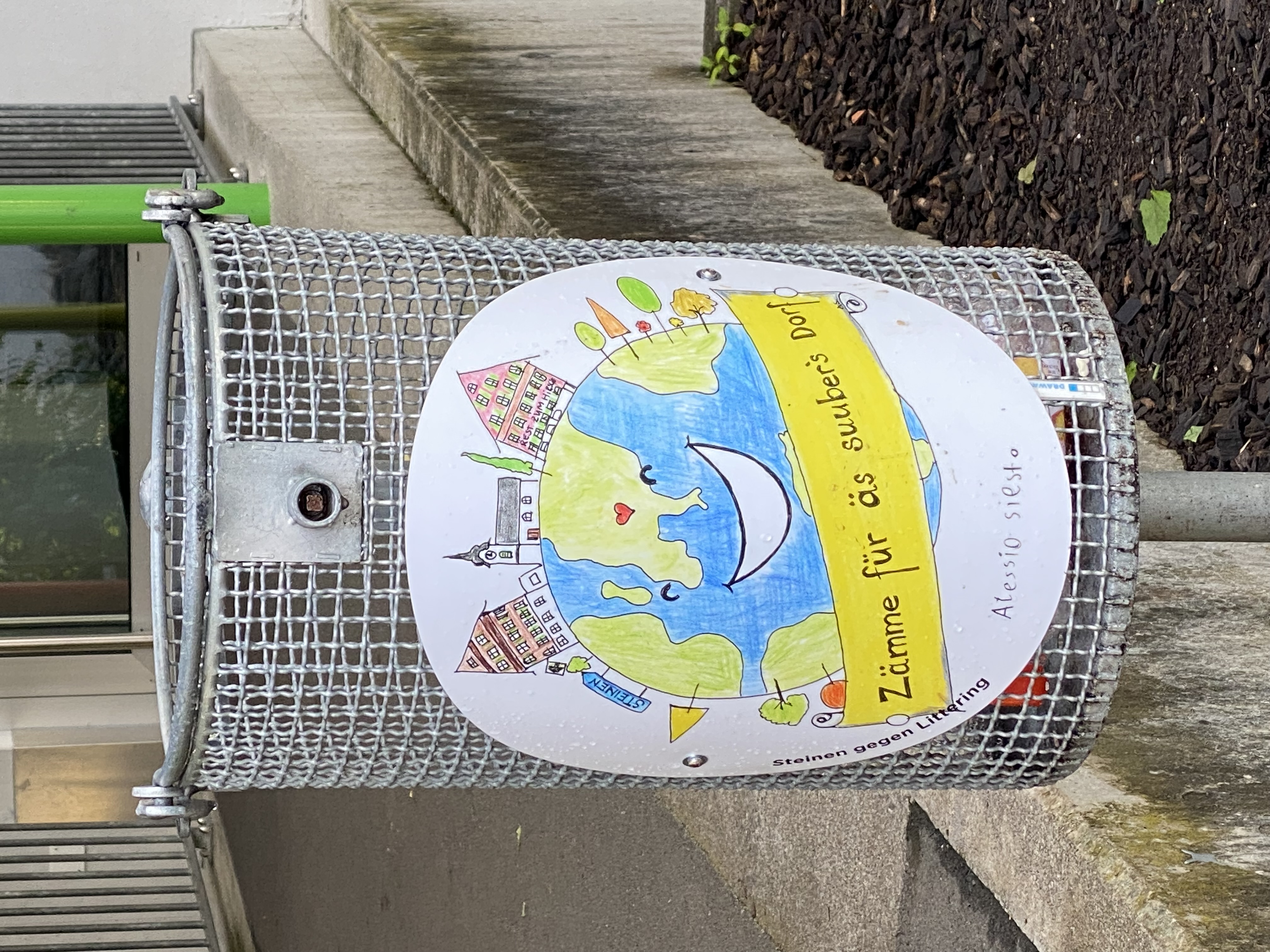 Seit Mitte Mai 2025 zieren diese Bilder nun alle Abfallkörbe auf dem Schulareal und der näheren Umgebung.