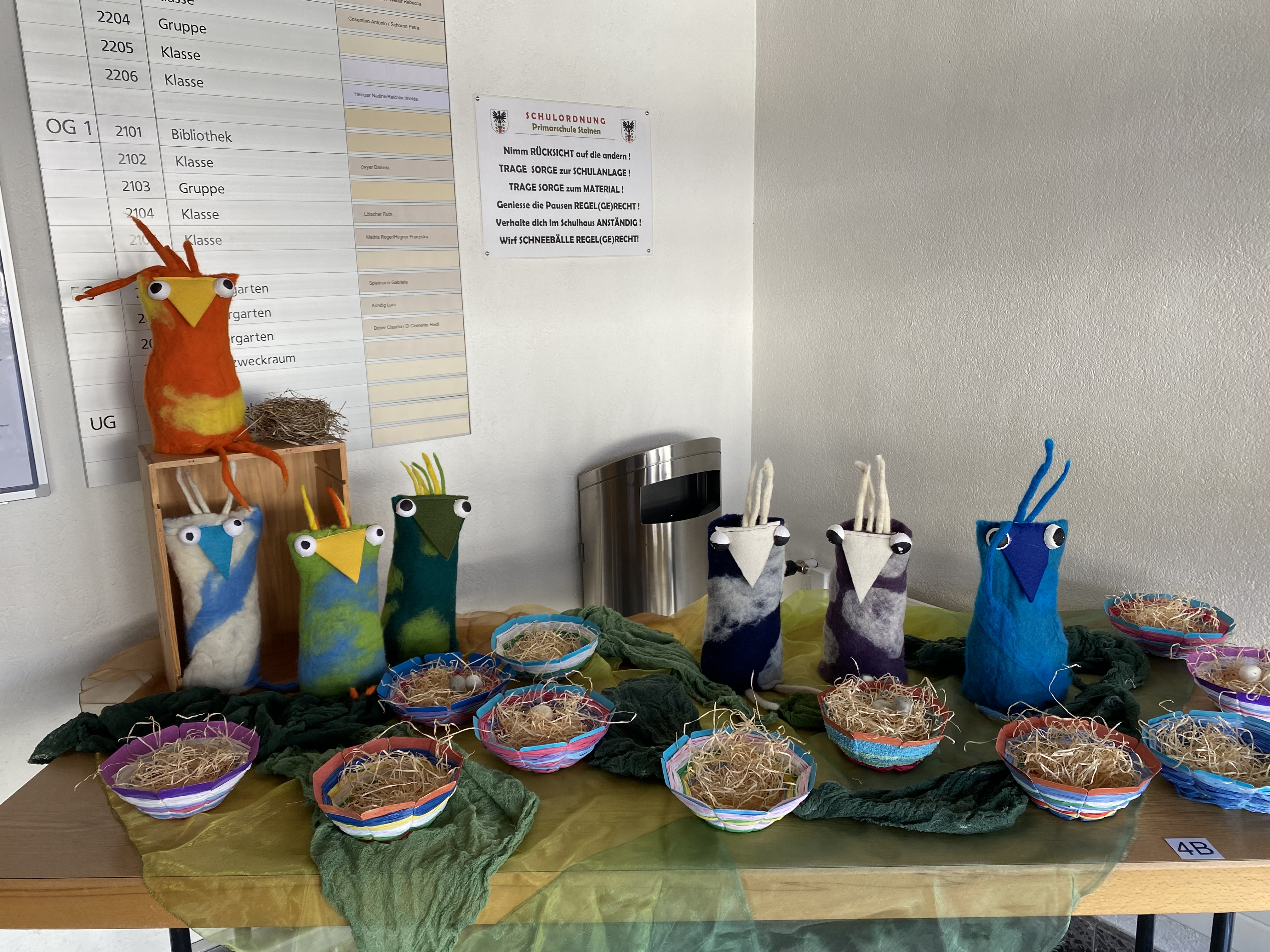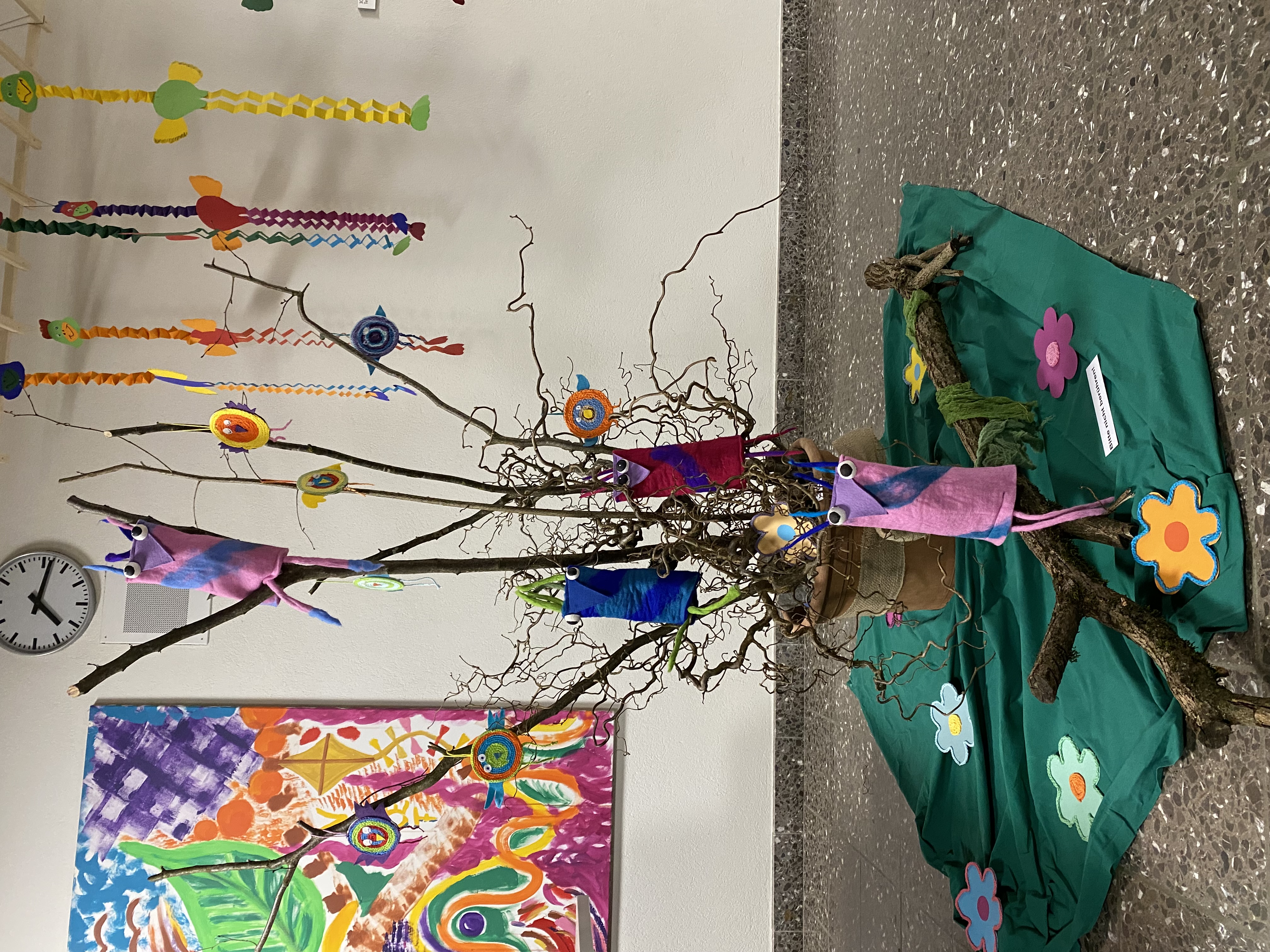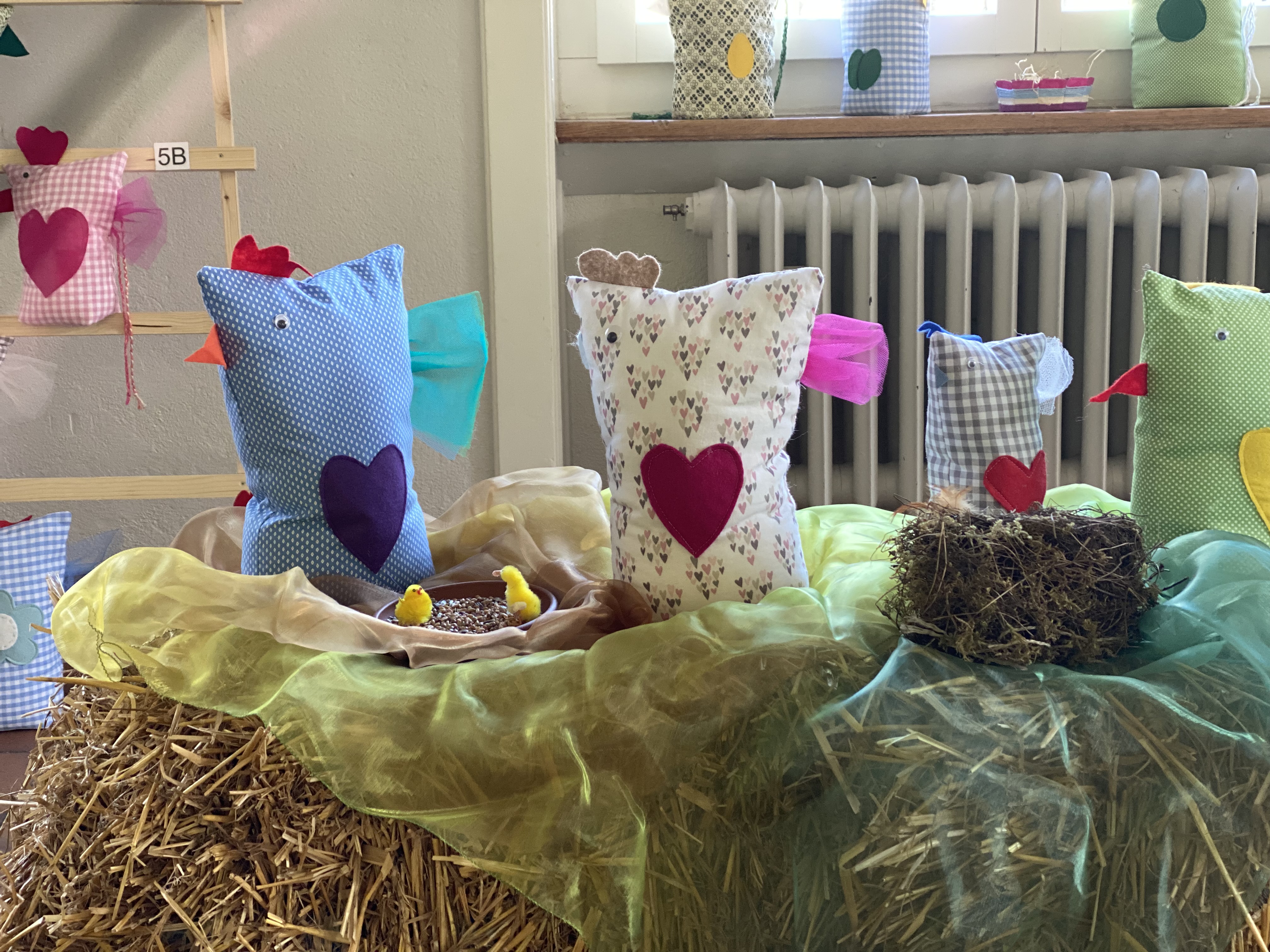 Wie schon seit vielen Jahren üblich, waren in der Woche vor den Schulbesuchstagen die Türen zu den Handarbeitszimmern geöffnet. Was unter der Woche zögerlich begonnen hat, endete am Freitag und Samstag in einem wahren Besucherstrom. Eltern, kleinere und grössere Geschwister, Grosseltern, Paten und Freunde liessen es sich nicht nehmen, wieder einmal Schulluft zu schnuppern. Alle Stufen vom Kindergarten bis zur 6. Primarschule konnten in dieser Zeit besucht werden. In den Schulhauseingängen luden die in der Handarbeit hergestellten, farbenprächtigen Hühner zum Bestaunen ein. Interessierte können die Ausstellung noch bis zu den Frühlingsferien besichtigen. An den Wänden reihten sich farbenfrohe, stimmungsvolle Bilder aneinander.